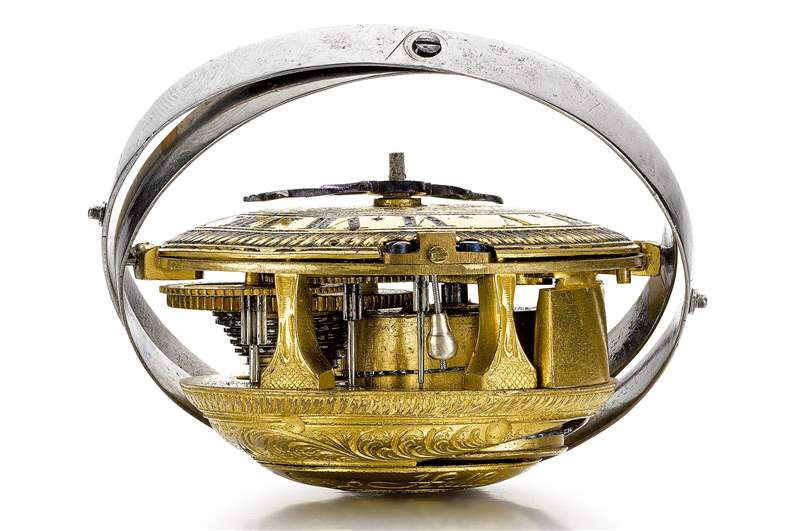 在早期,人們?cè)鴩L試在手表上放置擺錘,但收效甚微。帶邊緣擒縱機(jī)構(gòu)的擺錘式腕表,1680年。