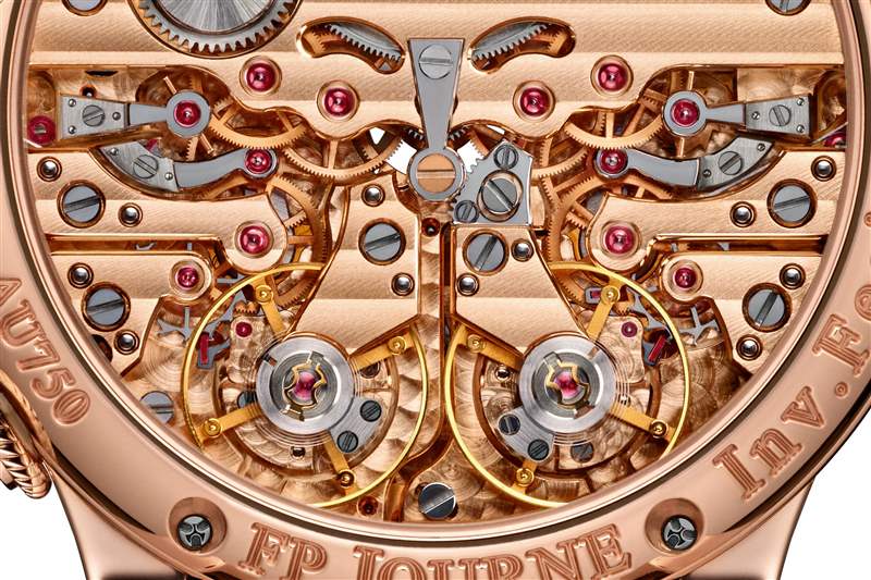 2020款JOURNE CHRONOMèTRE à RéSONANCE的兩列行駛列車,擒縱機(jī)構(gòu)和天平,配有雙瑞士杠桿式擒縱機(jī)構(gòu)。