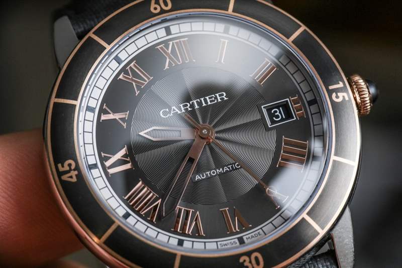 Cartier Ronde Croisiere 的表圈設計看起來像旋轉的潛水員表圈,但它是固定的。精鋼表圈采用 ADLC 黑色啞光涂層,賦予其獨特的外觀。這在鋼和金型號上非常有效,在表圈和 18k 玫瑰金表冠上增加了一些 18k 玫瑰金鍍層。黑色尖晶石用作表冠的凸圓形材料,與許多其他卡地亞手表更常見的藍色藍寶石水晶形成鮮明對比。皇冠非常符合卡地亞設計 DNA 的范圍。