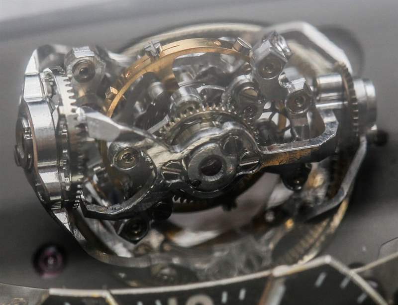 還有一個看起來相當驚人的三軸陀飛輪的問題。市面上還有其他三軸陀飛輪,但沒有一款能像這一款那樣呈現得如此明顯和完整。整個系統位于一個轉動的旋轉底板上,然后陀飛輪在另外兩個軸點上移動。軸一的旋轉時間為 60 秒,軸二的旋轉時間為 19 秒,軸三的旋轉時間為 17 秒。這些是一些快速旋轉時間,因此 Cabestan 三軸陀飛輪的主要有趣元素之一就是您可以在觀看它運行時享受多少運動。