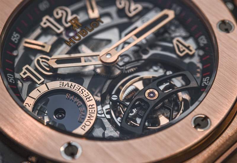 我以前說過,我會再說一遍,如果你不是 Hublot(或任何品牌)的粉絲,這個型號不會讓你皈依。但 Hublot 在這里所做的是提供一種深刻的 Hublot DNA 品牌體驗,其中包括許多他們的核心客戶群正在尋找的東西。Hublot Big Bang Tourbillon 5 天動力儲存指示器內部搭載全新自制 HUB6016 機芯,其橋板設計圍繞陀飛輪的圓形設計。陀飛輪表殼寬 13.6 毫米,有一個有趣的黑色橋梁,其中包括該品牌全新的有趣拱形設計。從陀飛輪發出的是機芯中的一系列同心圓圖案,這些圖案在手表的表盤側以及表殼后部可見的機芯(我認為后者是,