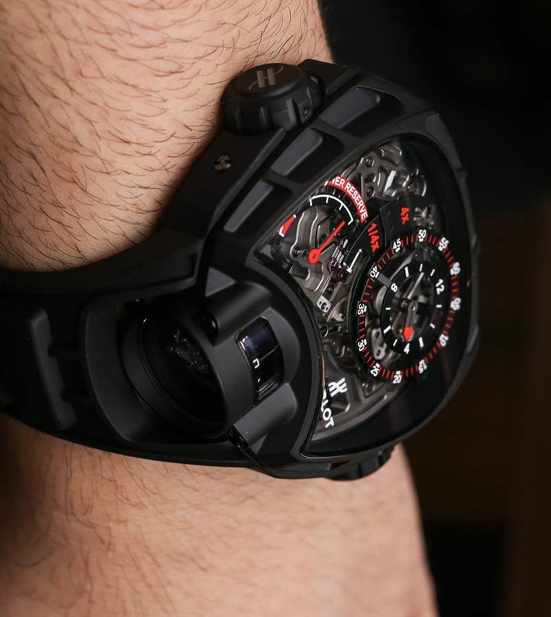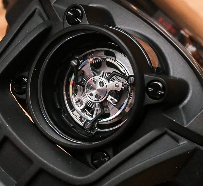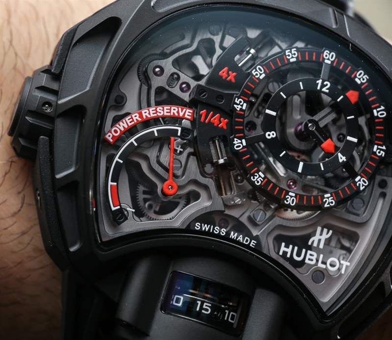 與 Hublot MP-12 Key of Time 一樣,(后來生產(chǎn)的)Hublot MP-05 LaFerrari 手表有一個垂直方向的陀飛輪,從表殼的下側(cè)可以看到。雖然你可以不同意,但在我看來,Hublot MP-05 LaFerrari 和 Hublot MP-12 Key Of Time 手表是近親。那么,Hublot MP-12 Key Of Time 手表的奇特復雜功能又是什么呢?該機芯能夠?qū)r間顯示為加速四倍或減慢四倍。這意味著您可以將手表設(shè)置為在僅經(jīng)過 1 分鐘后顯示 4 分鐘已經(jīng)過去……或者在實際經(jīng)過 1 分鐘后顯示僅經(jīng)過 15 秒。