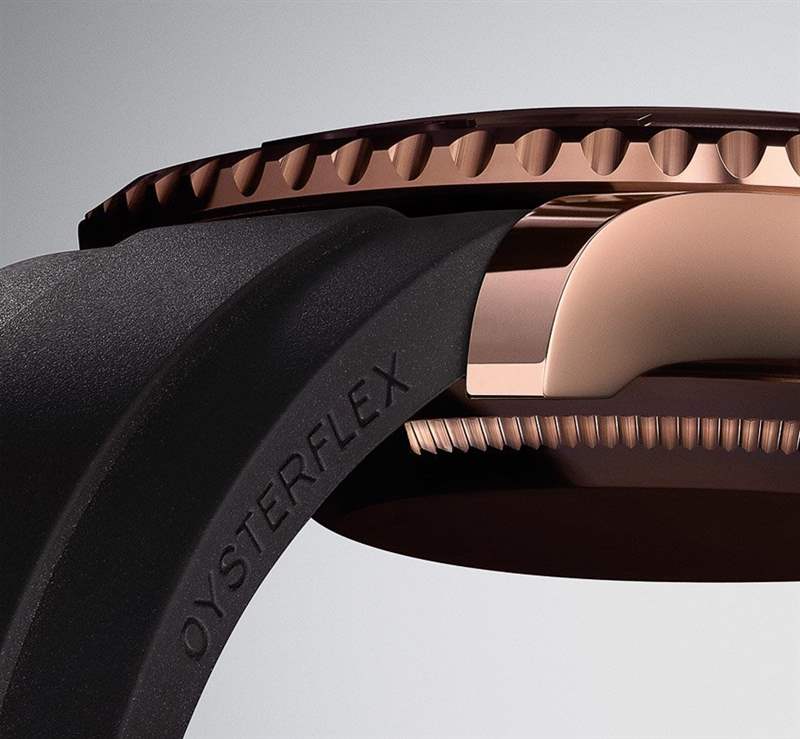 Yacht-Master 表殼采用 18k 永恒玫瑰金,與另一款新品 Rolex Oysterflex 表帶完美搭配。這是勞力士自己的話來描述這個很酷的新官方勞力士手鏈替代品:“在美學(xué)、柔軟度和舒適度方面,它類似于橡膠表帶,而其阻力可與金屬表鏈相媲美。表鏈通過靈活的鈦和鎳合金金屬刀片連接到表殼和 Oysterlock 安全表扣。刀片采用高性能黑色彈性體包覆成型,特別耐環(huán)境影響,非常耐用,對手表佩戴者來說完全惰性。為提升佩戴舒適度,Oysterflex 表鏈內(nèi)部配備專利的縱向緩沖系統(tǒng),可將腕表穩(wěn)固地佩戴在手腕上。手鏈配有 18 ct 永恒玫瑰金蠔式安全扣,可防止意外打開。”