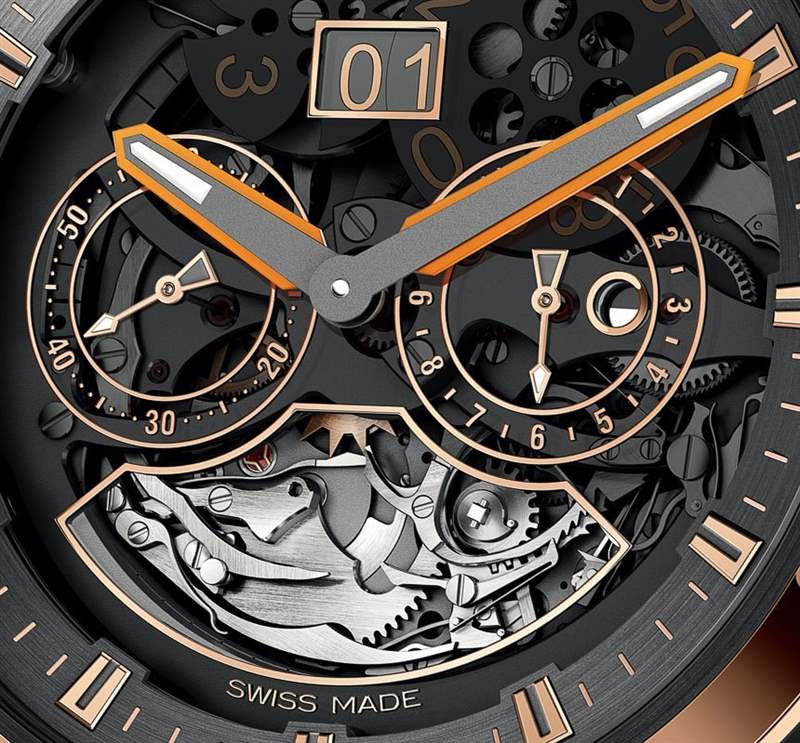 回到 Christophe Claret Allegro 的表盤側,我們看到機芯的其他復雜功能。12 點以下是一個大日期窗口(我第一次在 Christophe Claret 手表上看到這樣的窗口)和兩個小表盤。左側子表盤用作輔助秒盤,而右側子表盤是第二時區,由沿 12 小時刻度的附加時針表示。第二時區表盤上的一個小窗口用作晝夜指示器,以便佩戴者知道其他時區是上午還是下午。靠近表冠的表殼一側的按鈕可以調整日期或將第二時區指針前進一小時。總的來說,Christophe Claret Allegro 內部相當復雜的機芯包含 520 個零件(非常復雜)。