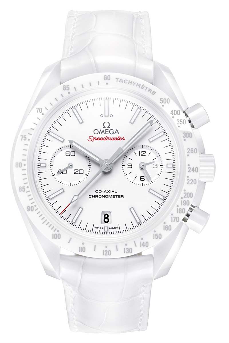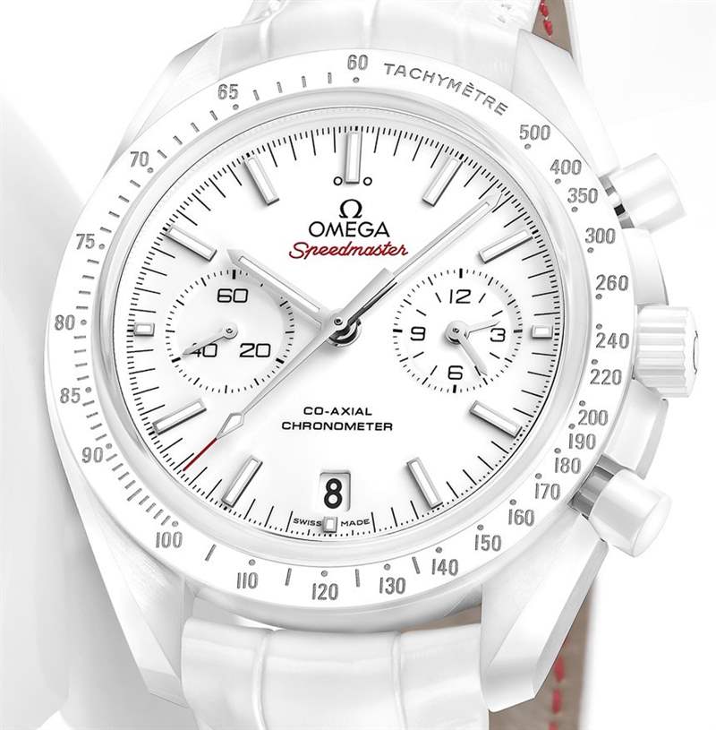 歐米茄超霸月之白面腕表采用與超霸同軸計時碼表系列其他產品相同的 44.25 毫米表殼尺寸。白色陶瓷表面配有 18k 白金指針和時標(隨著時間的推移,它們最終看起來比精鋼更好)。與 2012 年的白色超霸腕表不同,歐米茄超霸系列月之白面表盤上有一些受歡迎的紅色——這是一個次要的,但我喜歡的受歡迎的設計選擇。過多的單時性并不總是好的。