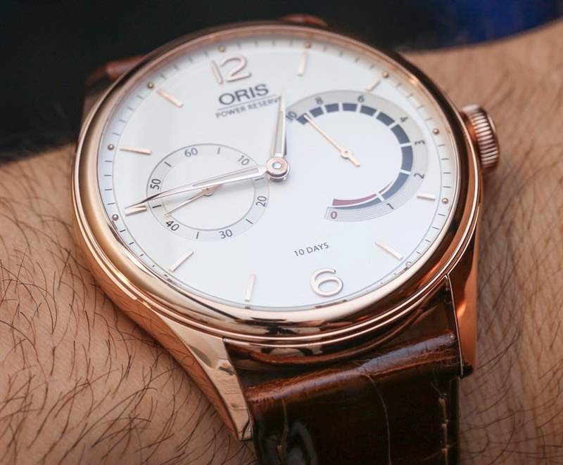 更有趣的是整整 240 小時或 10 天的動力儲存長度。這意味著 Oris Calibre 110 在以 21,600 bph (3Hz) 的頻率運行時,可以在繞組之間運行一周以上。表盤上的“10 天”小標簽提醒您這一事實。那個較低的標簽我不介意,但我確實認為 Oris 在他們的品牌標志下印刷“Power Reserve”并不是特別有用。這就像汽車公司在車身上放置無用的標簽和標志一樣。我記得我在成長過程中看到諸如“燃油噴射”和“全輪驅動”之類的愚蠢的東西出現在汽車的側面或后部。這會喚起品味和區別嗎?這對路上的其他汽車是否有某種有價值的用途?或者這只是某種奇怪的廣告,目的是幫助車主對他們的購買感覺更好,并且讓鄰居們意識到他們自己的汽車可能沒有這樣的功能。就個人而言,我不希望我的車上有那些東西。