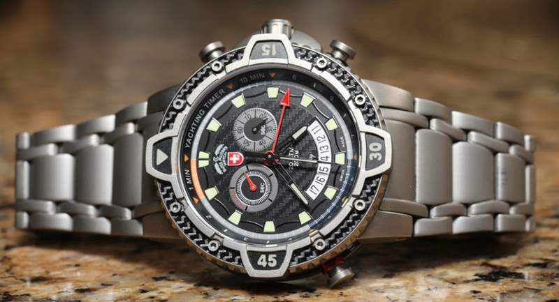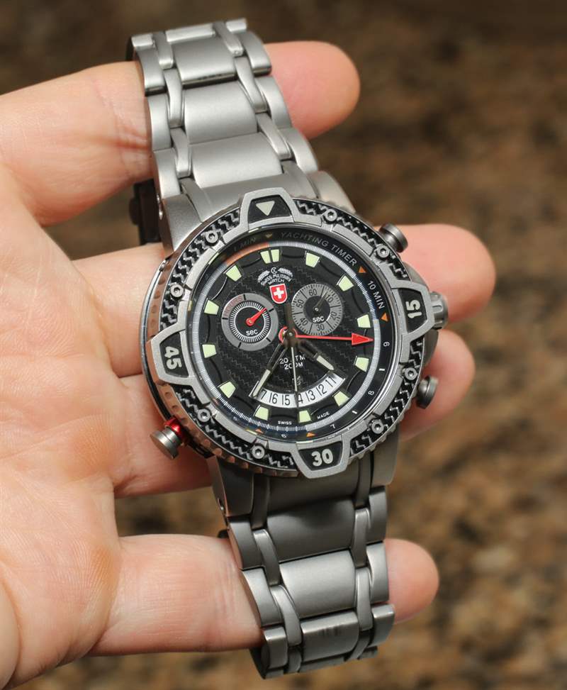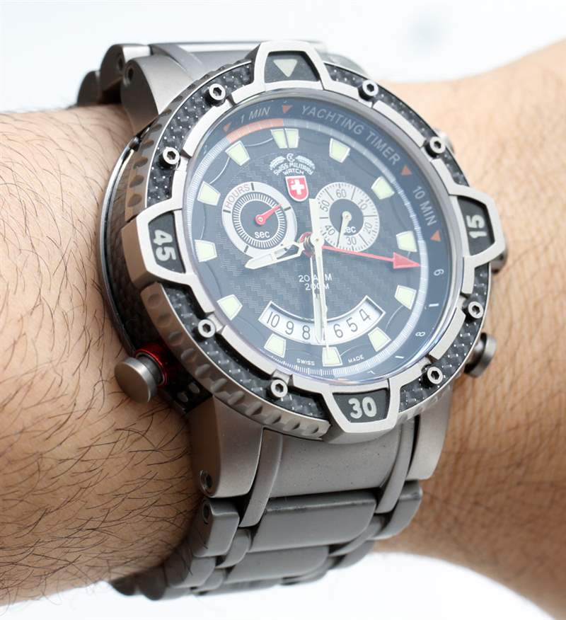 CX Swiss Military 手表由瑞士的Charmex生產(chǎn)?。我們長(zhǎng)期以來(lái)一直是他們時(shí)而古怪、時(shí)而非常酷的軍用風(fēng)格運(yùn)動(dòng)手表的粉絲。今天我們要回顧一下游艇計(jì)時(shí)器臺(tái)風(fēng)。時(shí)至今日,我最喜歡的時(shí)計(jì)之一是Swiss Military 20,000 Feet Diver(aBlogtoWatch 評(píng)論).?20,000 英尺潛水員雖然絕對(duì)愚蠢,但它是一款出色的手表。雖然它的預(yù)期用途永遠(yuǎn)不會(huì)被凡人所需要,但它的執(zhí)行非常出色,因?yàn)樗鋫淞顺竦拟伣饘俦須ぃ梢栽诤5组e逛。今天我們換個(gè)方向來(lái)看一款適合在水面附近使用的手表,也是鈦金屬的。Typhoon 繼承了 20,000 英尺潛水員的傳統(tǒng),將功能與設(shè)計(jì)師的樂(lè)趣相結(jié)合。