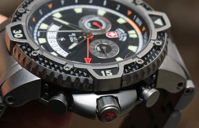 與機(jī)械式 20,000 英尺潛水員不同,臺(tái)風(fēng)是一款石英表。我們的想法是將帆船賽計(jì)時(shí)器、計(jì)時(shí)碼表和鬧鐘整合到一塊手表中,采用耐用且炫酷的設(shè)計(jì)。臺(tái)風(fēng)最好的部分很容易就是表殼和表鏈。Swiss Military Watch 在表殼設(shè)計(jì)和構(gòu)造上真的全力以赴。45 毫米寬的外殼在細(xì)節(jié)方面是我以前從未見(jiàn)過(guò)的。表殼由鈦和碳纖維元素制成。表盤(pán)周圍有一個(gè)大的旋轉(zhuǎn)表圈和三個(gè)按鈕以及一個(gè)旋入式表冠。表殼上的所有細(xì)節(jié)都很有趣,從許多鈦螺絲到表殼側(cè)面包裹的碳纖維。