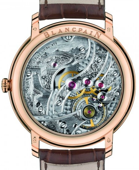 內含寶珀表廠制造的caliver 15B手動上鏈機芯,Blainpain在每個機芯上手工雕刻一些場景。理想情況下,場景是由客戶定制的。對于 Only Watch 2011,他們制作了一個來自摩納哥的場景。對于那些本身不是特別訂制的,寶珀會從瑞士、法國、日本、中國和香港等地挑選和雕刻風景和地標(哎呀,我想知道寶珀表在哪里賣得最多)。請留意稍后的文章,其中包含有關此雕刻過程的一些更有趣的細節。