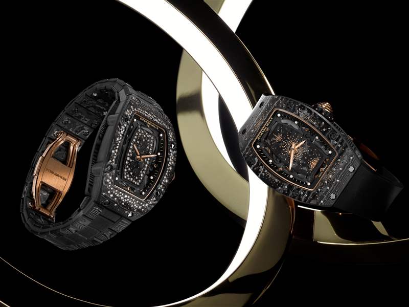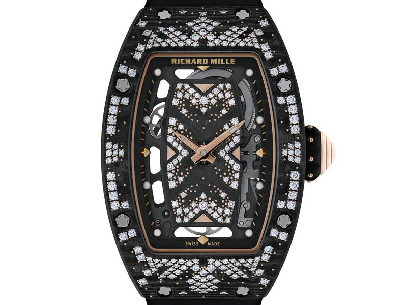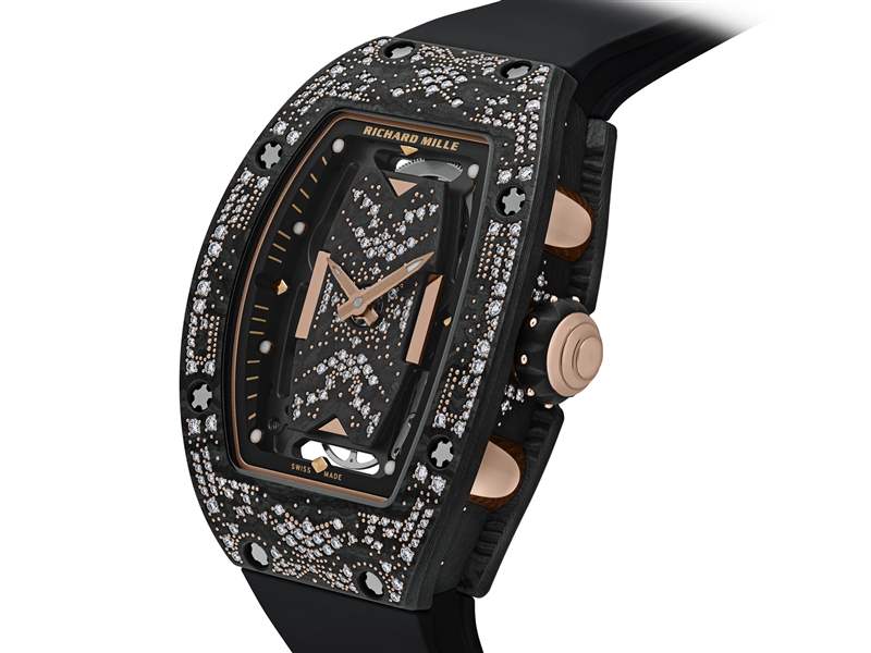 新作在工藝上體現出 RICHARD MILLE 寶石鑲嵌工藝的突破——在極為堅硬的 Carbon TPT 碳纖維表殼上密鑲鉆石。由于碳纖維材料的物理特性與金屬不同,制表工匠需要在表殼上鉆孔,然后嵌入玫瑰金鑲爪,最后再鑲入鉆石。碳纖維低調的啞光黑色更襯托出鉆石的火彩。