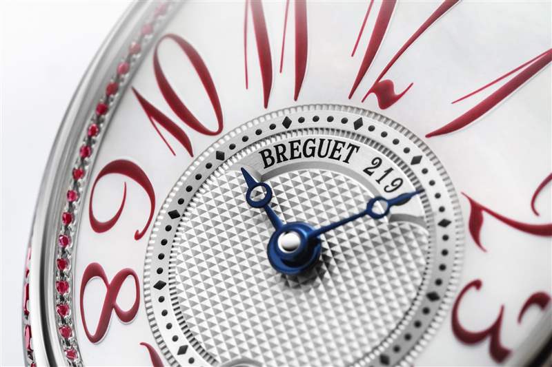 新作以紅寶石取代 Reine De Naples 系列的鉆石鑲嵌——超過100顆紅寶石勾勒出鵝蛋形表殼的圓潤輪廓,突出白金表圈的纖細構造。溫婉的白色珍珠母貝表盤搭配酒紅色時標,偏心式時分盤裝飾精致的璣鏤雕紋,賦予腕表幾分微妙的古典氣息,6點鑲嵌一顆水滴形切割紅寶石成為點睛焦點。