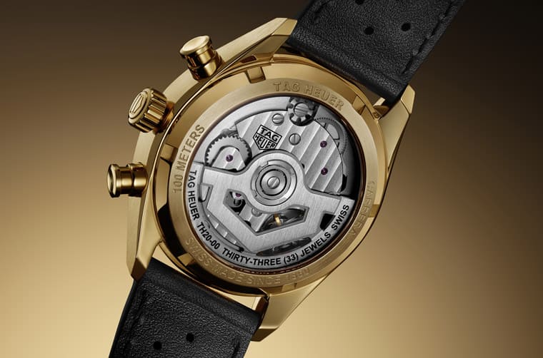 表背透明底蓋露出Carrera Chronograph黃金計(jì)時(shí)碼表搭載的Heuer 02自動(dòng)機(jī)芯(編號(hào)則是TH20-00),這枚機(jī)芯擁有狀似品牌盾形標(biāo)志的鏤空自動(dòng)盤,其能雙向上鏈,而且動(dòng)力儲(chǔ)存達(dá)到80小時(shí)展現(xiàn)現(xiàn)代制表工藝的進(jìn)展,同時(shí)機(jī)芯底板具有日內(nèi)瓦波紋、夾板則有弧形同心圓紋,另外自動(dòng)盤表面也有拉絲修飾,佩戴者在表背也能欣賞到導(dǎo)柱輪與擒縱系統(tǒng)的作工與動(dòng)態(tài),強(qiáng)調(diào)現(xiàn)代作品改用透明底蓋的奧妙,把機(jī)芯之美直接放送在佩戴者眼前。