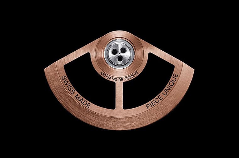 Artisans de Genève替手表選用玫瑰金重新制作自動盤,并將之鏤空,同時根據表主的意見加以倒角修飾,同時也還手工替自動盤上的刻字上色,使其充滿濃濃的工藝氣息。