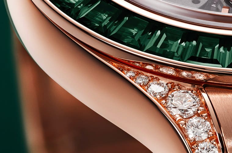 永恒玫瑰金表冠以手工在中間部分鑿出一個深約0.3mm的凹槽,Artisans de Genève接著于其中填入綠漆之后拋光、燒制固色,讓表冠的裝飾顏色可以和表圈的寶石顏色呼應。
