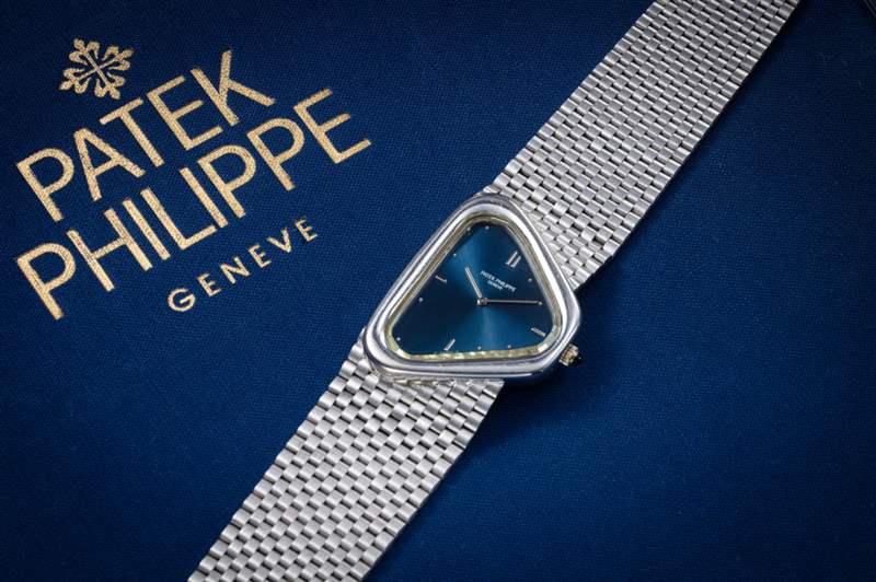 這是一只不尋常的腕表,一只不尋常的百達翡麗客訂腕表,獨一無二,三角形表盤、白金刻度、18K白金表殼與網狀鏈帶為一體式設計,除了造型出奇,最懾人之處其實在于它的表鏡是一塊重達13.43克拉的portrait cut鉆石,扁平造型,兩面皆有拋光,頂面邊緣的刻面清晰可見,高度拋光的清澈效果為深藍色旭日放射紋表面增添了令人驚艷的光芒,并在表背內側刻有鉆石克拉數與獨特的編號3843/1。