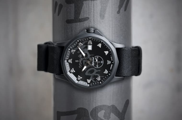新款Admiral海軍上將42自動表還有另外兩款陶瓷材質作品,品牌創作時受到涂鴉藝術啟發,這是港港地區如今屢見不鮮的街頭文化,因此昆侖表干脆將這種風格引入成為手表的特色。其中一款采用黑色噴砂陶瓷表殼,搭配黑色NATO表帶,面盤與表殼、表帶一樣都是黑色,與灰色系的時標和指針配合顯得低調內斂,品牌精心在面盤加上涂鴉字體的夜光CORUM標志,在光線充足時這個設計不易被注意,一旦在黑暗環境中,昆侖標志便會發出耀眼的夜光效果,相同手表在明暗環境下能體現兩種不同個性。