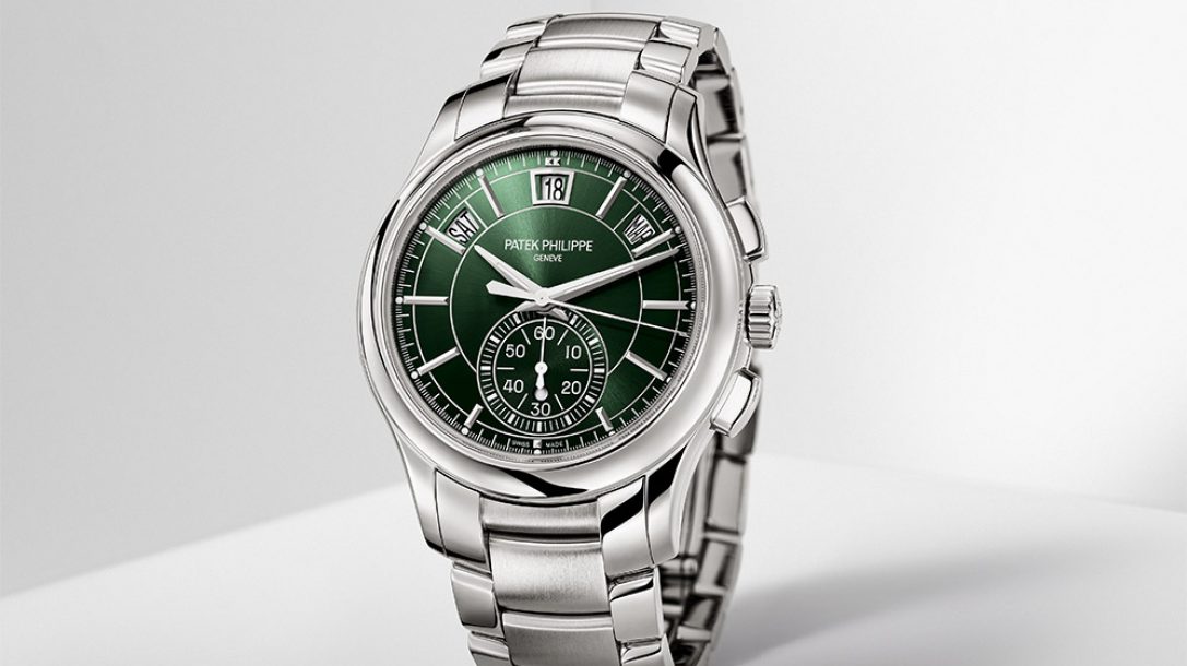 雖然鋼鐵對某些人來說很常見,但它正在成為百達翡麗的收藏品。截至今年年底,該金屬腕表中僅售出28款時計。其中,全新飛返計時碼表年歷!?繼玫瑰金和鉑金的精致變化之后,現在出現了一個絕對的運動時尚設計,將直徑42毫米的表殼與拋光和緞面拋光表面與發光的橄欖綠色陽光表盤相結合。時間數據以同樣通風和對比鮮明的布局顯示。快速秒針和6點鐘位置的60分鐘計時盤用于測量和顯示短期時間。在此累加器內部,一個謹慎的標記根據其白色或黑色指定白天和黑夜。年歷仍保留在構圖的上部。它只需要在一年中在3月1日進行一次修正。日、日期和月份顯示在以弧形排列的相應窗口中。