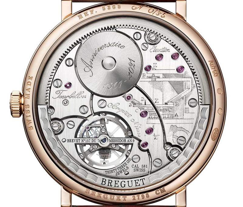 帶有“鏤空蘋果”的傳統(tǒng)藍(lán)色指針指向由羅馬數(shù)字組成的小時(shí)環(huán)。這些腕表由581型機(jī)芯驅(qū)動(dòng),透過藍(lán)寶石表背清晰可見。這一獨(dú)特的機(jī)械裝置以其紀(jì)念性銘文和雕刻而著稱,忠實(shí)再現(xiàn)了寶璣為陀飛輪控制器專利申請?zhí)峤坏乃十?。該自?dòng)上鏈機(jī)制可提供超過80小時(shí)的動(dòng)力儲(chǔ)存。